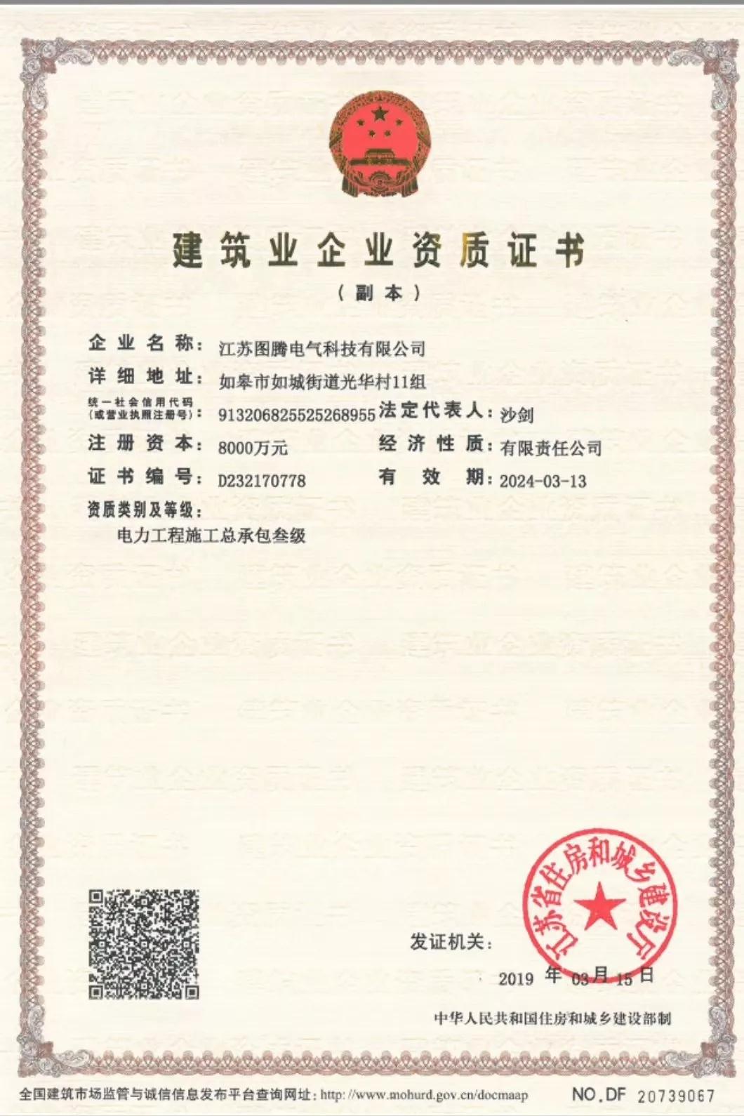 2019年3月15日,江蘇圖騰電氣科技有限公司通過國家相關部門嚴格審定認可,獲得電力工程施工總承包三級資質。這標志著公司由傳統電力設備制造商向配電領域綜合服務商成功轉型,為公司提升綜合競爭力,擴大市...