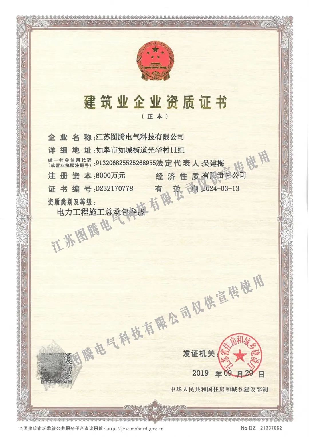江蘇圖騰電氣科技有限公司榮獲 “承裝(修、試)五級(jí)電力設(shè)施許可證”
