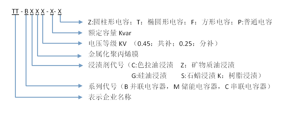 例:TT-BSMJ 0.45-40-Z 低壓干式圓柱形電容器,浸漬劑為石蠟,介質(zhì)為金屬化聚丙烯薄膜,電壓等級為450V,額定容量為40kvar